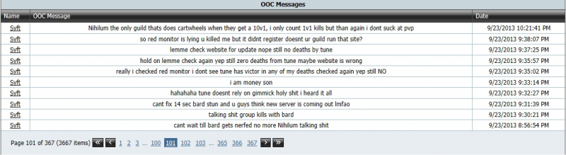 http://i66.photobucket.com/albums/h2...psfab7a5bb.png Tune decided to sink lower then the MQ using piece of pond shit he is and just added a kill on me by editing the boards! Here's how the board read a few weeks ago! http://i66.photobucket.com/albums/h2...ps16fce337.jpg And here's what the boards look like NOW! http://i66.photobucket.com/albums/h2...ps997fb952.png So once again Nihilum proves they are the most dishonorable lying scum on the server willing to go through any lengths to prove they can PvP, even editing the boards they run with lies! So what else did they edit on their boards, how much is truth or fiction, guess we'll never know! |