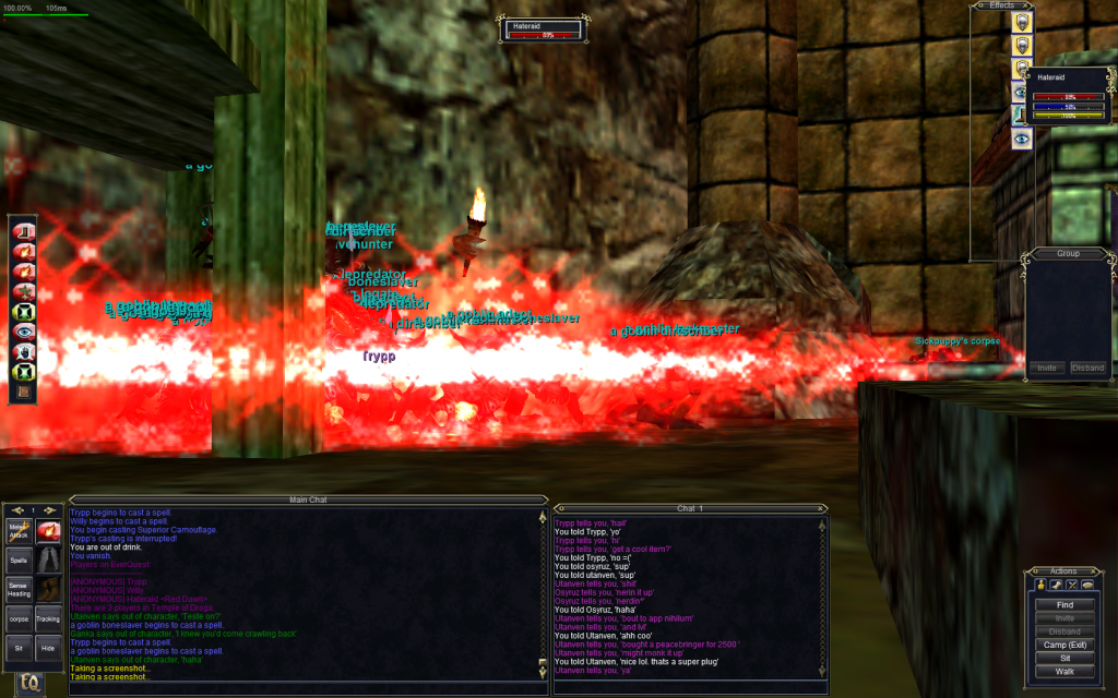 Not sure if anyone cares, but I have been running into Willy, Trypp, AKA Queen down in Droga massively exploiting. I have seen like 100+ mobs being taken down by them at one time which they are both green to a 45. Im guessing they take is pretty nice. Just a heads up, someone might want to put a stop to this.