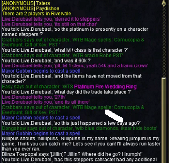 As usual this person is in "Nihilum" class act this guild is has 99% of the servers RMT'rs/exploiters/scammers/account strippers |