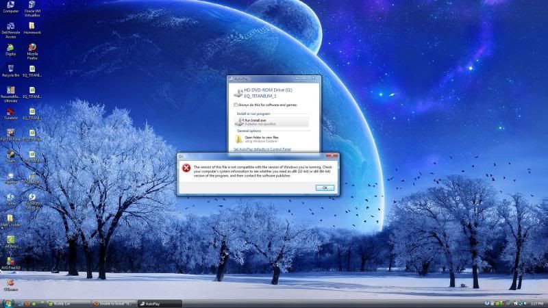 I just realized my error seems a little different than others. My problem is not when using Daemon Tools. Once the autorun is selected for the first disk (after being mounted), I get this error. http://img.photobucket.com/albums/v706/Muchew/ss.jpg Sorry thats hard to read "G:\ The version of this file is not compatible with the version of windows you're running. Check your computer's system information to see whether you need an x86(32-bit) or x64(64-bit) version of the program, and then contact the software publisher." I am running Vista home premium, 64 bit, Intel core duo. Sorry if this is posted elsewhere, I have sincerely been searching. Edit 2: Upon some reading at other websites, I think it may be a bad download? Trying the one linked in the setupguide. Edit 3: Yup, it was the download. |