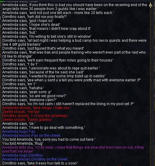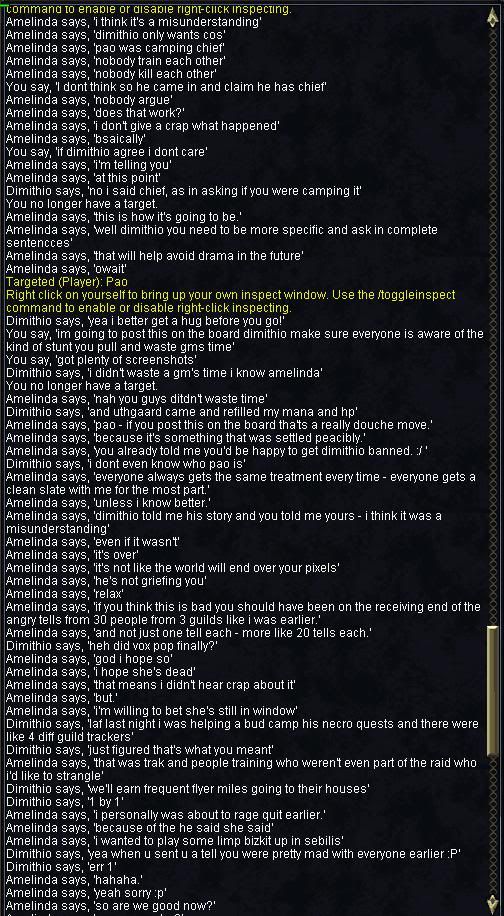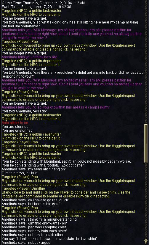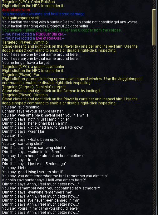 This image shows me at chief camp in Temple of droga (only two person is in the zone me and Zeelot), I have just cleared the PH and spotted Dimithio's corpse, I checked if he was online, time stamped and I took a screenshot (I had a feeling he would come back and try something stupid AGAIN). http://i1104.photobucket.com/albums/...imithiolie.jpg This chat showed chief spawned, I killed Chief and looted chief. Temple of Droga spawn time is 18 - 20 minutes. So obviously Chief had spawned and 20 min have passed already from the time i cleared PH and spotted Dimithio's corpse. About 15 - 20 mins later dimithio arrive at my camp. Here is the conversation: http://i1104.photobucket.com/albums/...ang1/1SS-1.jpg http://i1104.photobucket.com/albums/h331/Pvang1/2SS.jpg http://i1104.photobucket.com/albums/h331/Pvang1/3SS.jpg http://i1104.photobucket.com/albums/h331/Pvang1/4SS.jpg http://i1104.photobucket.com/albums/h331/Pvang1/5SS.jpg Naturally when you arrive at a camp and someone else is there you simple ask to get in line. This is not the case for Dimithio who believe the game revolve around him. He think he is friend with the GM's so they favor him. I'm glad that is not the case. He will try and do anything even the stupidest thing to try and get a camp that he wants. I'm usually a nice guy everyone knows already who come across me. I never petitioned Dimithio, remember that! We could've solved it peacefully by ourself but Dimithio had to petition a lie to Amelinda. I'm doing everyone a big favor by posting this so if Dimithio pull something stupid and waste another gm's time you can say you heard it here already and you know whats up. In conclusion this is a Free to play game the GM's dont get paid. Don't give them a hard time. I have mad respect for Uthgaard, Rogean, Hobby, Amelinda and anyone who worked hard to get this old mmorpg running just so we all could enjoy once more from the start. P.S. Anyone who had bad experience with Dimithio please do so and post it here. |