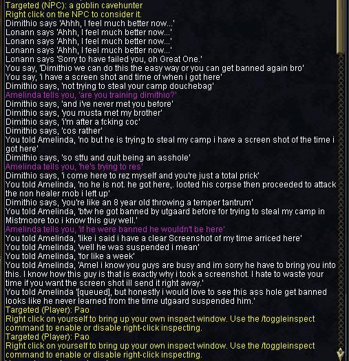 Here is the reason why GM's are having near death headaches. This isn't the first incident that I had with Dimithio. The first incident happened in Mistmoore at Cloaked Dhampyre camp. He claimed that he is camping dhampyre only after I have been clearing and contantly killing dhamp's PH for over 2 hours. He then have the damn nerves to Petition and waste Utgaard's precious time to come out and investigate. Turns out Dimithio is a fucking moron so Utgaard suspended his account for a week. Well... now he is back and I got some screenshots of his ass kissing retarded behavior.