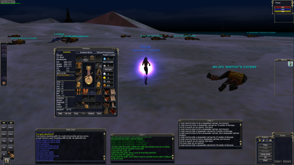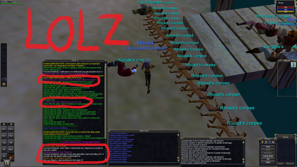 http://i857.photobucket.com/albums/a...tofcorpses.png yeah, yeah, Laugh all ya want and tell me how fail i am. But anyone who's played a bard and learned how to AoE kite knows how rough it is. especially when you start at level 9 with just your level 2 dot pulling trains big enough to 1 shot you if you fuck up with the slightest mistake I'm too stubborn to take the easy way out and just wait for level 18 for the longer ranged DoT. so i told myself "Trial by fire. learn the hard shit first, and the easy shit will be Trivial." as you can see above, it didn't go so well at first... Stick it out and you will start to see bodies on the ground that aren't yours! http://i857.photobucket.com/albums/a...stBigTrain.png Overall my experience so far has been fun! and yes, even with all those deaths, I'm still ahead. started at 9 and I'm now 14! :D |