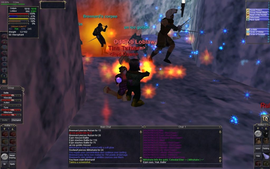 We didn't get a lot of kills early on until we turned around, but here's one: http://i1165.photobucket.com/albums/...d/brennard.jpg Ruban had Sootwulf and Brennard sticking to him and I peeled Brennard off him. Tina almost in for the save but not quite. Survived this one so no +1 to the death count today, but it's coming closer to happening lately. |