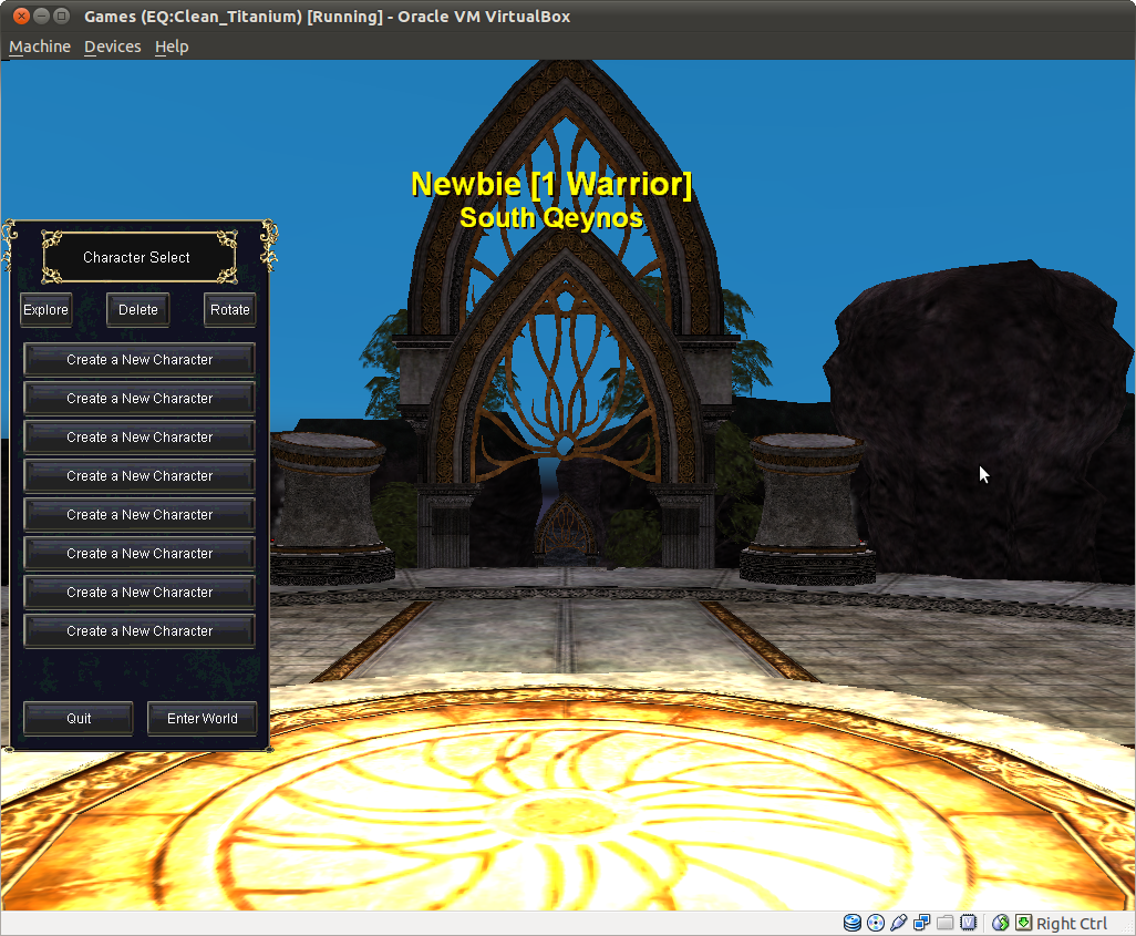 I have, like the original poster, decide to go the hard path versus the easy(easier). And I installed EQ on a Windows XP Guest fully patched virtual on an Ubuntu 10.10 fully patched install. After much wrestling with WineD3D and Guest additions and 3d acceleration settings I got it to load and logged in to Project 1999 server. I get the following screenshow character creation screen. No amount of pressing the buttons on the left displays any characters. http://www.qsl.net/ky1t/pictures/Scr...VirtualBox.png Any help would be appreciated. I'll probably try Wine Emulator. But I haven't compiled from source lately since there are .deb binaries available. **UPDATE** - I have gotten a little further. The download and install of the latest NVidia drivers on the Linux host gave me a better experience. The buttons actually responded and opened up new menu choices. That worked for awhile then at random times the buttons sometimes crashed to the Windows Guest desktop. There was an option to submit an error report. I am not sure if these bug reports are sent to Sony or the project1999 team. But I clicked send once out of the multiple crashes. Thanks in advance, Cheswick |