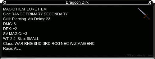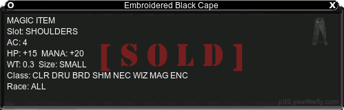 Various Lowbie Items Send a tell to Welgrim in-game, PM me, or reply here if interested. Purple Headband: 3.2k http://p99.yourfirefly.com/item/Purple Headband/sold Embroidered Black Cape: 400p http://p99.yourfirefly.com/item/Embr...lack Cape/sold Werewolf Skin Cloak: 275p http://p99.yourfirefly.com/item/Werewolf Skin Cloak Dwarven Plate Pauldron: 275p http://p99.yourfirefly.com/item/Dwarven Plate Pauldron Iksar Scaled Gloves: 150p http://p99.yourfirefly.com/item/Iksar Scaled Gloves Cloak of the Ice Bear: 175p http://p99.yourfirefly.com/item/Cloa... Ice Bear/sold Firerune Brand: 65p http://p99.yourfirefly.com/item/Firerune Brand Dragoon Dirk: 50p http://p99.yourfirefly.com/item/Dragoon Dirk |