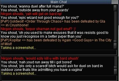 I guess your only recourse to the merciless ass whoopings I hand you is to cry like a bitch on forums. Like when I went after you in Neriak and you ran into the wizards guild and refused to come out saying you needed mana like you always do when you bitch out of fighting me. Yet i waited outside for 15 minutes and you gated. http://i66.photobucket.com/albums/h2...psvwkkyptd.jpg |