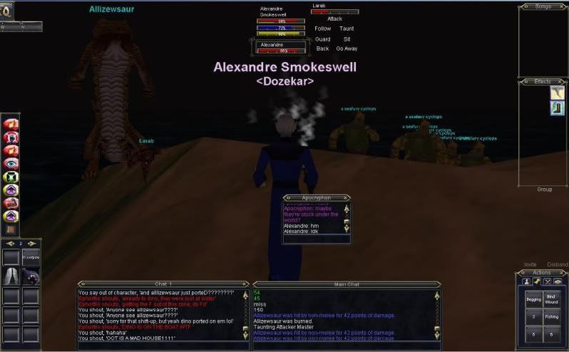 This after a mob of seafuries was seen raping the holder of AC camp. This train then proceeded to run rampant across the zone and kill quite a few people. Dino ported while I was fighting it and was gone for quite a while, then suddenly ported back with the train of seafuries. As of right now apparently one of those seafuries ported back to AC spawn point and is spawned in on top of the cyclops spawn there. tehfux? |