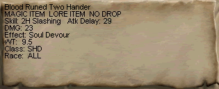 Comparing it to the Butcherblock Hammer: The Butcherblock Hammer (.755555) Slot: PRIMARY Skill: 2H Blunt Atk Delay: 45 DMG: 34 STR: +10 CHA: -10 WIS: +5 Effect: Superior Healing WT: 10.0 Size: LARGE Class: CLR PAL BER Race: DWF GNM Maybe one of these per server from a GM event? Blood Runed Two Hander (.793103) Slot: PRIMARY Skill: 2H Slash Atk Delay: 29 DMG: 23 Effect: Soul Devour WT: 9.5 Size: LARGE Class: SHD Race: ALL Soul Devour is a 500 point lifetap. GM event is a possibility but there is virtually nothing on the net for this thing. Having a sword this powerful there should be WAY more information regarding it. Everyone that had one would be waving their dick around about it. |